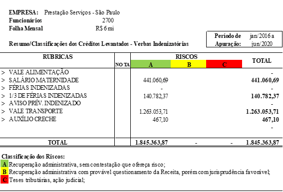 O case acima retratado refere-se a um comércio varejista, com 490 colaboradores e folha mensal de R$ 770 mil, onde foram localizadas as rubricas de vale alimentação, salário maternidade, aviso prévio indenizado e vale transporte como passíveis de recuperação e exclusão da base de cálculo da CPP gerando fluxo de caixa em apenas 30 dias, na via administrativa.