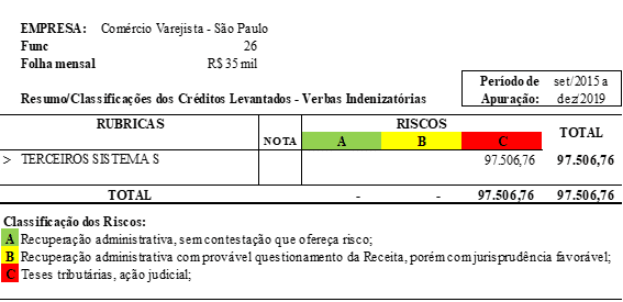 É possível que a atualização do crédito apurado corresponda a quase 03 vezes a folha de salários, o que representa uma excelente oportunidade de recuperação e fomento financeiro.